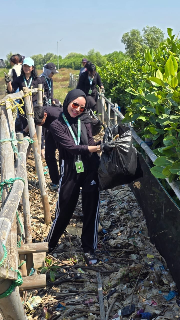 Mahasiswa/i President University kolaborasi dalam kegiatan bersih2 sampah di Kawasan Konservasi Mangrove Pesona Alas Mangrove Desa Muarabaru pada 24 Juli 2025